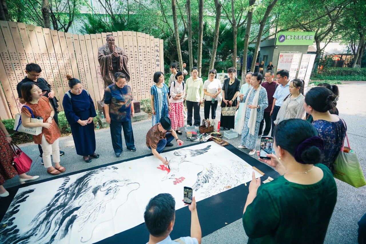 会议最后一天,与会嘉宾走进重庆市南岸区涂山镇论语公园,参加释菜礼,感受活起来的传统文化。著名书画家吕荣起、贺鲲昇现场挥毫泼墨,完成《千字文》百米长卷和龙凤翱翔水墨画作。